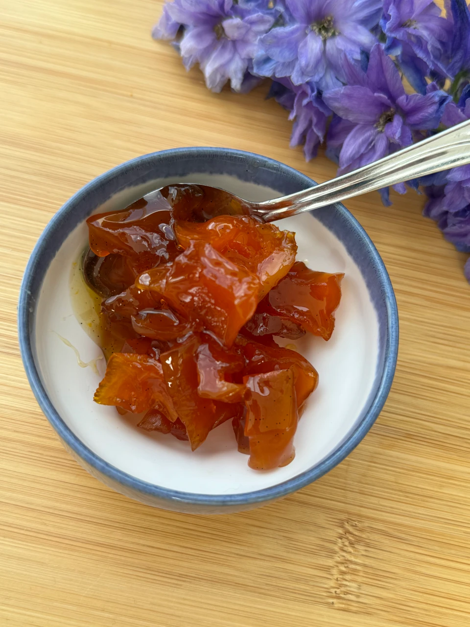 - Lad græskarstykkerne simre under låg, til stykkerne er gennemsigtige, og lagen er har konsistens som en tyk sirup. (det kan godt tage op til to timer)